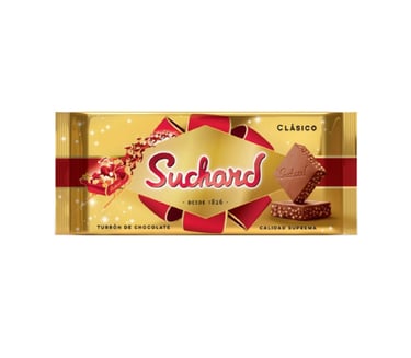 Turrón de chocolate con arroz inflado, textura crujiente y sabor clásico de Suchard.